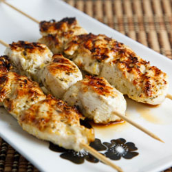 Slice chicken diagonally so you have strips (about 1/4" or so thick). I like to thread my chicken on the skewers (back and forth) instead of cubes. I find the chicken cooks more evening, the chicken won't rotate on the skewer and you get more crispy bits.