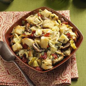 In large skillet, saute mushrooms and onion in butter until tender. Add garlic; cook 1 minute longer. Stir in salt, rosemary and pepper. In large bowl, combine bread cubes, artichokes, almonds, tomatoes, basil and mushroom mixture. In another bowl, whisk eggs and broth. Pour over bread mixture; stir until moistened.