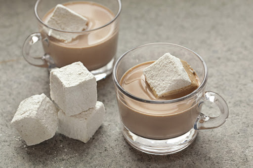 9. To serve, rewarm the chestnut hot chocolate over medium-low heat and divide among 8 mugs. Top the hot chocolate with the marshmallows and serve.