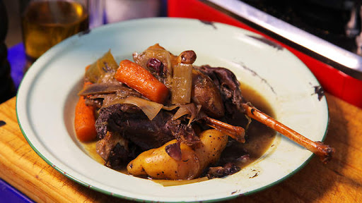 Place the hare pieces in a bowl with the onion,carot, crushed garlic, bay leaf, cloves,thyme,brandy and red wine. Cover the bowl, refrigerate and leave to marinate overnight. Preheat the oven to 350F. Drain the hare pieces on kitchen paper. Strain the liquid into a bowl, reserving the vegetables and herbs. Heat the oil and butter on a medium heat in an overn-proof casserole dish and brown the hare pieces on all sides. Season with salt and pepper. Stir in the vegetables and herbs; cooking for a few minutes.Dust with flour and stir well. Add the marinade liquid, stir well and bring to a simmer. Cover, and bake in the preheated oven for about two-and-a-half hours. Transfer the cooked hare pieces to a dish. strain the rich sauce over the meat. Sprinkle the meat with chopped parsley and serve.