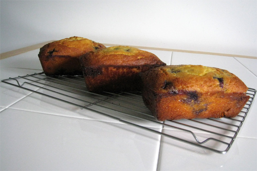 Mix dry ingredients and set aside. In large bowl beat eggs then add honey, lemon juice, lemon extract and melted butter. Mix thoroughly. Add dry ingredients and whisk or beat until well combined. Fold in blueberries. Pour batter into mini loaf pans.