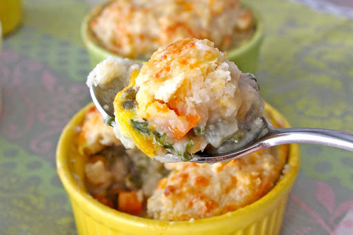 In a small bowl, beat the eggs with 4 tablespoons water. Spoon the batter evenly among the ramekins onto the filling and brush with the egg wash. Bake until the biscuit tops are golden brown and vegetable mixture is bubbly, about 30-35 minutes. Let rest for 5 minutes before serving.