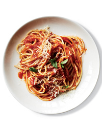 Add the spaghetti, cooking water and basil sprig to the tomato sauce and cook over moderately low heat, stirring gently, until the pasta is al dente and the sauce is thickened and clings to the strands, 8 minutes longer. Discard the basil sprig. Transfer the spaghetti to bowls. Drizzle with olive oil and garnish with basil leaves. Serve with grated cheese.