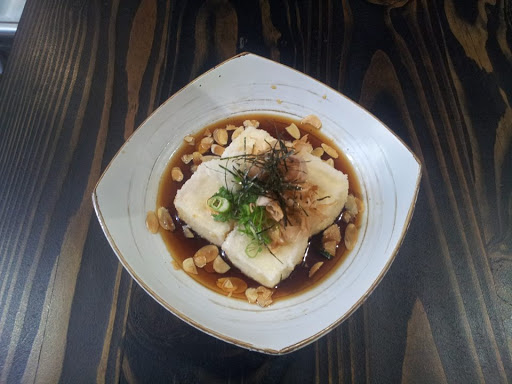 - Deep fried silken tofu served with bonito flakes, almond flakes and dendashi.