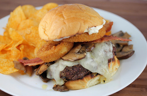 While hamburgers are grilling, split the hamburger buns and place them cut side down onto the grill. Cook until lightly toasted. To assemble burgers- place each hamburger patty onto the top of the bottom half of each bun. Top with mushrooms, bacon, and onion rings. Spread the garlic aioli onto the bottom of the top half of the bun. Place the top half of the bun onto the burger.