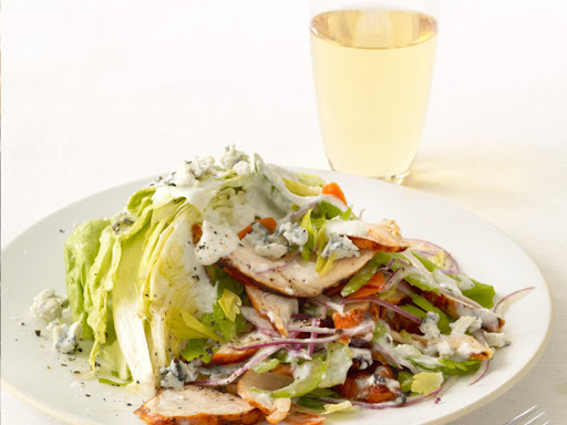 Puree 3/4 cup blue cheese and the sour cream in a blender until smooth. Add half of the blue cheese dressing to the bowl with the chicken; add the sliced celery and celery leaves, red onion and carrot and toss. Divide the lettuce wedges and chicken salad among plates. Drizzle with the remaining dressing and sprinkle with the remaining 1/4 cup blue cheese.