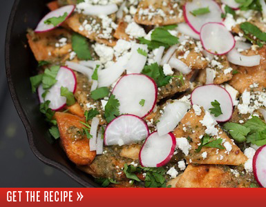 3. Add 1 cup of the tomatillo sauce back to the skillet and bring it to a simmer over medium heat. Add the chips in an even layer and cover with the remaining sauce. Cover the skillet and cook until the chips are semi-crisp (chips on the bottom of the skillet will be softer than those at the surface), 3 to 5 minutes, depending on the thickness of the chips. Turn off the heat and serve in the skillet, sprinkled with the remaining sliced onion, the remaining ½ cup chopped cilantro, the radishes and the cotija cheese.
