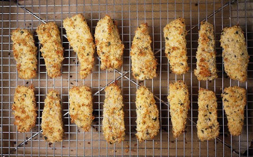 * Bake the sticks on a rack. This allows you to achieve an even golden brown coating all around. It also keeps the fish from sticking to the pan… or parchment paper… or silpat… or aluminum foil. I’ve tried them all and a rack is your best bet, hands down.
