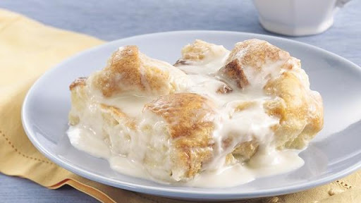 4 To reserved tablespoon syrup, stir in frosting and yogurt. Microwave on High about 20 seconds or until melted. Stir; pour over warm bread pudding and spread to cover. Cut into 12 servings. Serve warm with ice cream; garnish with mint and sprinkle with powdered sugar.