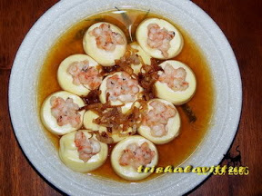 3. Put some corn flour on the surface of each pieces of toufu before placing (2) on top. With corn flour, prawn won't be seperated from toufu after cooked.