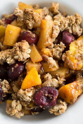 4. Spoon fruit filling into casserole dish and level out. Crumble the topping over top of the fruit in an even layer. Bake, uncovered, at 375F for around 30 minutes, checking on the topping after 20 minutes. If the topping starts to brown too soon, you can remove it from the oven and cover with tin foil for the rest of the time. The crisp is ready when the fruit is fork tender and the topping is golden.