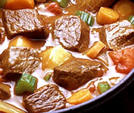 Fry diced bacon in large saucepan. Salt & pepper the beef. Dip beef in flour and brown in the bacon fat, adding oil if necessary.