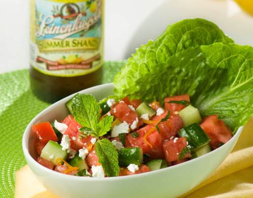 In a large serving bowl, mix the honey, extra virgin olive oil, lemons and Leinenkugel’s Summer Shandy. Mix well, and add chopped watermelon, tomato, cucumber and mint. Layer two romaine leaves on a salad plate or in a salad bowl, scoop a quarter of the mix onto the leaves and sprinkle goat cheese over top. Repeat three times to layer.