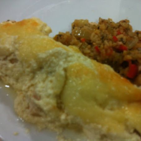 Wash, cut up and boil the chicken; debone and cut into bite-sized pieces. Set aside. Saute onion in 2 tbsp margarine in a large skillet. Add chicken and tomatoes with chilies; simmer together until heated throughout. While chicken mixture is simmering, heat the sour cream until the bouillon cubes are thoroughly dissolved. Do not boil or cream will curdle. Warm tortillas in microwave to make rolling easier. Place a small amount of chicken mixture in each tortilla, roll up, and arrange in a well-greased 9 X 13-inch casserole dish. Pour the sour cream sauce over all. Top with grated cheese. Bake for 30 minutes in a 325 degree oven.