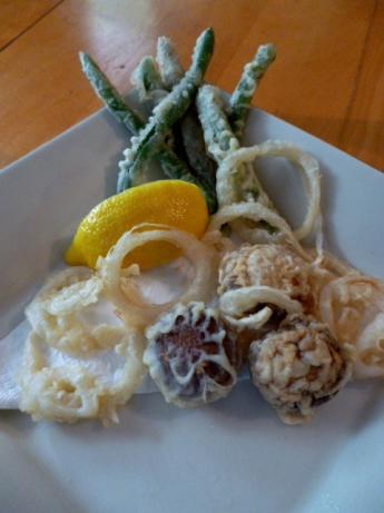 1 In a large bowl place the egg yolks. 2 Add iced water gradually, stirring (preferably with hashi(chopsticks)) and blending well. 3 Add flour all at once, stir BRIEFLY; that is well enough to coat but leave the lumps and bumps! 4 To fry vegetables heat a large frying pan with a half-inch oil (or more if necessary) and heat on high. 5 Coat selected large vegetables in batter and fry for a minute or two on each side.