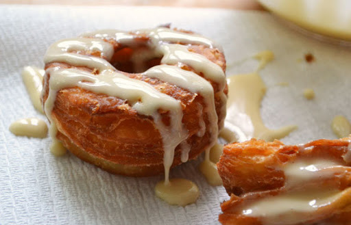 Meanwhile, whisk together the icing sugar, maple syrup and enough milk, water or cream to make a drizzling consistency. Drizzle over the cronuts while they’re still warm.
