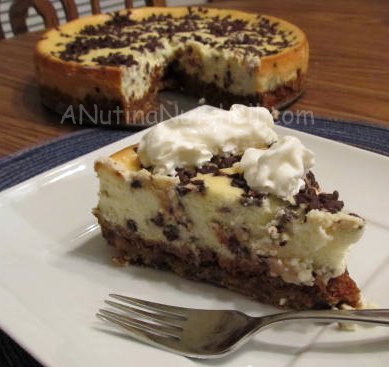4. Toss 1/3 of the miniature chocolate chips with 1 tsp flour to coat. (Prevents them from sinking to the bottom of the cheesecake). Mix into cream cheese mixture. Pour into prepared crust.