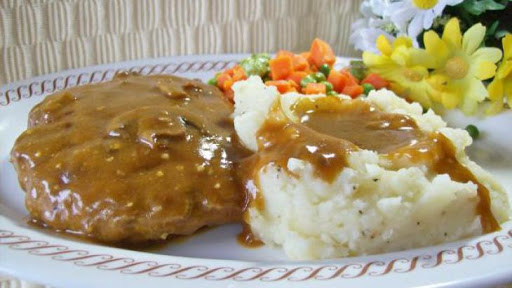 "An easy hamburger steak recipe, smothered in brown gravy. Good comfort food! Kind of a "blue-plate" special!"