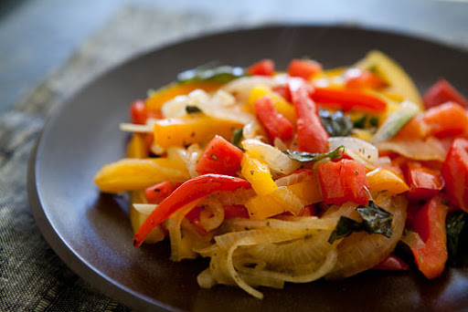 Add the peppers and stir well to combine with the onions. Sauté for 4-5 minutes, stirring often. The peppers should be al dente—cooked, but with a little crunch left in them.