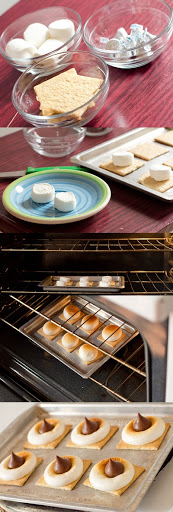 Place graham cracker squares on a cookies sheet. Set a half of a marshmallow, sticky side down, on the squares. Broil or bake on low heat until mallows are golden brown.