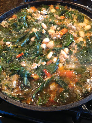In a large Dutch oven, cook the sausage, onions, and garlic over medium-high heat until the sausage is browned and crumbly, about 6 minutes. Drain, if necessary. Stir in the broth, Swiss chard, and beans. Add salt and pepper, to taste. Bring to a boil; cover, reduce heat, and simmer until Swiss chard is tender, about 20 minutes. Serve immediately with mini cornbread muffins, if desired.