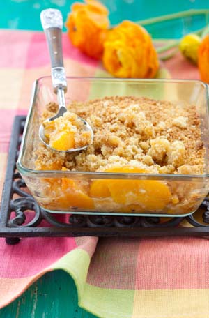 In a large bowl, add the flour, brown sugar, cinnamon, and salt, and whisk together well, breaking up any brown sugar lumps. Add the melted butter and stir until crumbly. Sprinkle this mixture over the top of the peaches.