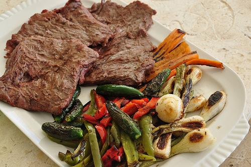 Marinate beef, peppers and sliced onion in other ingredients 48 hours or longer. Grill steak to desired doneness when near the end of grilling add peppers and onions to the grill until tender crisp.