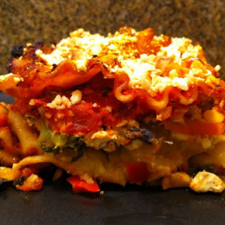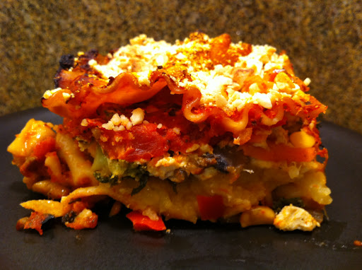 Spray a large baking dish. Prepare pasta to package directions. Drain and rinse. In skillet heat oil and brown ground beef and garlic. When beef is no longer pink, add salt, pepper, flour, sweet potato puree, and parmesan cheese. Mix well and remove from heat. In blender puree tomatoes, garlic, onions, and parmesan cheese. Pour from blender and set aside, in same blender puree cottage cheese, egg and mozzarella cheese. Spread 1/3rd of the pasta along the bottom of the baking dish. Spread the meat sauce over layer of pasta, then layer another layer of pasta, cover that layer with cheese sauce. Add another layer of pasta and cover with the tomato sauce. Top with C of mozzarella cheese cover with tin foil and bake at 350 for 30-35 minutes. Uncover and bake an additional 10 minutes or until the cheese topping is melted. Let set 10 minutes before cutting.