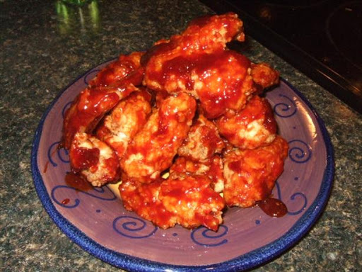 When oil is hot, dip each wing 1st in flour mixture, then milk mixture, back into flour. Fry in oil for 8-12 minute Add a minute or so if the breading isn't crisp enough for you. Drain. In LARGE bowl toss wing with sauce using tongs to really coat each wing. Serve immediately.