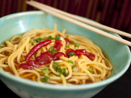 When tender, but not mushy, drain. Taste broth and add more soy, salt, vinegar, or heat as you like. Divide the noodles into bowls and pour hot broth over all.