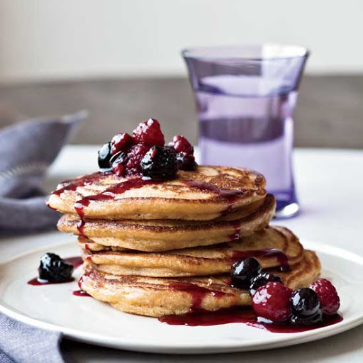 Set a griddle or skillet over moderate high heat and spray it with vegetable oil spray. When the pan is hot, spoon in 1/4-cup mounds of batter and spread to form 4-inch rounds. Cook the pancakes until the bottoms are browned and bubbles appear on the surface, 2 minutes. Flip and cook until browned on the bottom, 1 to 2 minutes longer. Serve the pancakes warm.