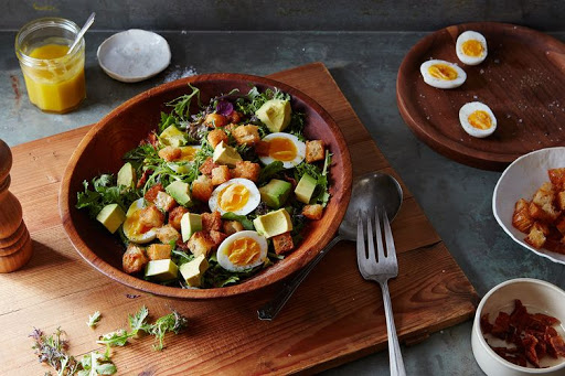 Add the mixed greens to a serving bowl and dress to your liking with your favorite vinaigrette. Add the bacon, croutons, eggs, and avocado. Serve at once.