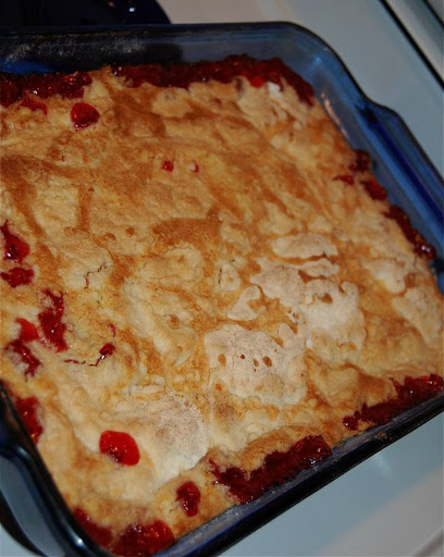 5. Use the handle of a spoon to poke mixture every couple of inches to blend in liquid slightly. Liquid doesn't have to be perfectly mixed in. If there are some little bits of dry cake mix left on top, that's fine.