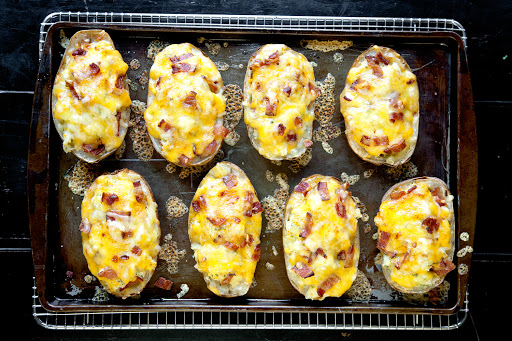 2. Halve potatoes lengthwise and scoop out insides with a spoon into a medium bowl, leaving ¼" of the outer layer of flesh and skin behind; transfer empty potato halves to a baking sheet. Combine scooped potato insides, ½ cup each cheddar and Gruyère, and sour cream, butter, chives, parsley, Tabasco, Worcestershire, and bacon and season with salt and pepper. Spoon mixture into potato halves and sprinkle with remaining cheese and paprika.