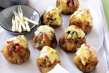 after your your potatos have finshed boiling cut them in to jack potatos then grate some cheese and put on top of your potatos now put them into your oven for 5 minutes.
