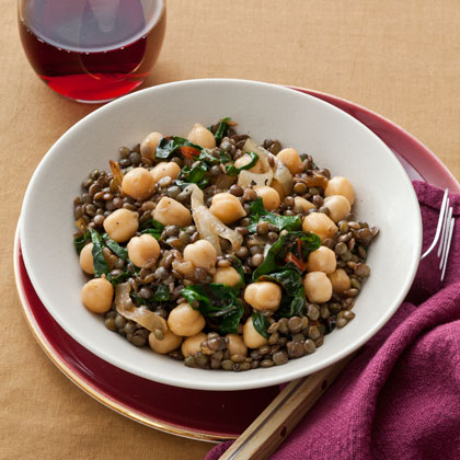 Heat a nonstick skillet over high heat; add 1 tablespoon olive oil to pan. Add onions to pan; sauté until soft, about 8 minutes. Reduce heat to medium; add garlic. Cook until onions are caramelized, about 20 minutes. Add Swiss chard leaves; cook until wilted and tender, about 5 minutes. Place 6 cups water in a pan; bring to a boil. Add lentils to pan. Reduce heat, and simmer; cook until tender, about 15 minutes. Add 2 teaspoons salt; let sit 5 minutes to absorb. Drain lentils; cool on a baking sheet. Combine chickpeas, lentils, chard-and-onion mixture, pomegranate molasses, lemon juice, 2 tablespoons olive oil, and 1/8 teaspoon each of salt and pepper.