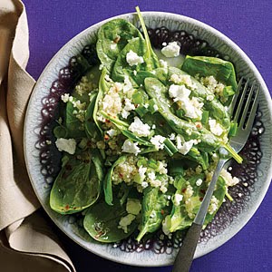 Cook quinoa according to package directions. Meanwhile, whisk together zest, juice, oil, chile flakes, salt, and pepper in a large bowl. Add spinach and onions. Mix in warm quinoa and sprinkle top of salad with feta, peppers and craisins.
