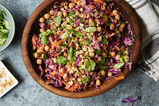 In the bowl with the dressing, add the chickpeas, shredded cabbage, and carrots and toss it all together with tongs until everything is coated.