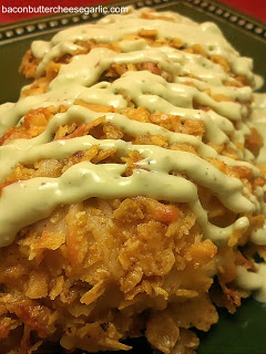 Put about half of the bag of chips into the food processor and blend. You should have 2-3 C crushed chips. (Reserve the rest of the bag in case you don't have enough.) Mix the shredded cheese and the crushed chips together.