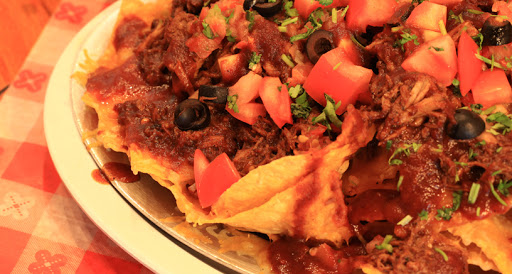 Brown ground beef and onions. Stir in taco seasoning. In separate bowl blend avocados, lime juice, salt, pepper, and tequila. Pour the avocado mixture into a baking dish and cover with seasoned ground beef. Bake at 350 for 10 minutes or until cheese is melted. Remove from oven top with tomatoes, daps of sour cream and sprinkle with cilantro and chives. serve with tortilla chips