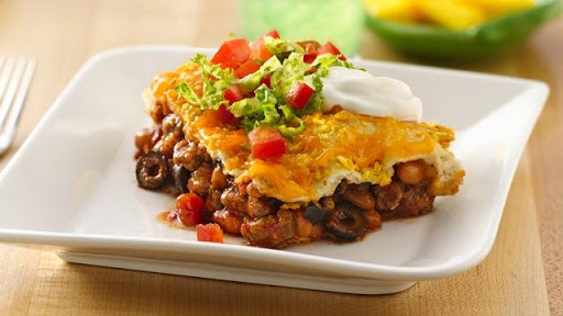 Stir beans into beef mixture. Cook until thoroughly heated and bubbly. Spoon into ungreased 13x9-inch (3-quart) glass baking dish. Unroll dough over filling; sprinkle crushed corn chips over top.