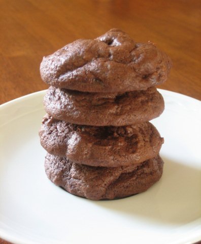 Whisk together the flour, cocoa, baking powder and salt in a medium bowl. Whisk the sugar, eggs, 2 tablespoons water and vanilla to blend in a separate large bowl. Stir in the dry ingredients and fold in the cooled chocolate using a rubber spatula. Fold in chocolate mint pieces. Chill dough to firm slightly, 10 minutes.