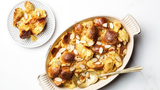 Brush baking dish with 2 Tbsp. melted virgin coconut oil instead of butter. Brush 2 Tbsp. melted virgin coconut oil instead of butter over cold bread pieces. Sprinkle with raw sugar, then top with ¼ cup unsweetened coconut flakes instead of almonds. Bake as directed.