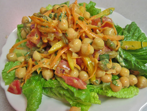 2. To make Salad: Toss together chickpeas, apple, celery, parsley, raisins, green onions, and walnuts in large bowl. Gently fold in Dressing. Season with salt and pepper, if desired. Serve with lemon wedges.