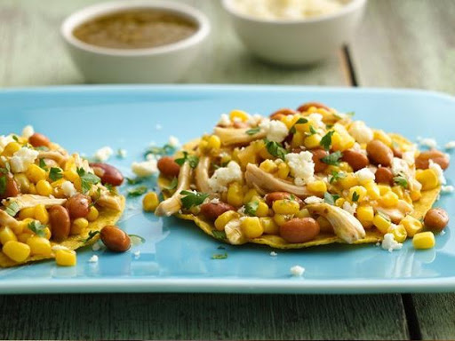 2 In large bowl, mix corn, beans, chicken, salsa verde and chipotle sauce. Spoon about 1/2 cup mixture on each tostada shell.