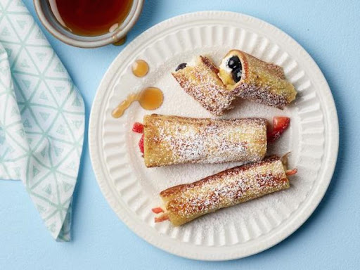 For the blueberry and cream cheese: Spread 1 teaspoon cream cheese in a 3/4-inch strip along the bottom of a slice of bread. Top with 2 rows of blueberries (about 2 to 3 tablespoons) being careful not to put too many down or you might not be able to roll it up. Starting with the side of the bread with the fruit, carefully roll into a tight log so that the fruit is snugly wrapped in bread. Continue with the remaining bread and fillings.