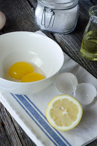 Drop the egg yolks into the basin of your food processor, then sprinkle them with salt. Spoon in the lemon juice and water.