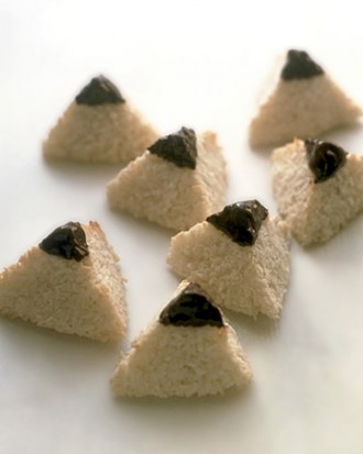 Moisten palms of hands with cold water. Roll 1 tablespoon of the coconut mixture in palms, squeezing tightly together 2 or 3 times to form a compact ball. Place ball on a clean surface, and using a spatula, flatten one side at a time to form a pyramid shape.