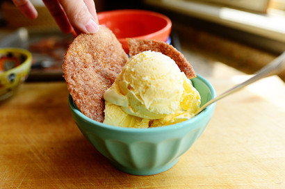 Brush butter on one side of the flour tortillas. Sprinkle generously with the cinnamon sugar. Flip tortillas to the other side, then sprinkle on the cinnamon sugar.