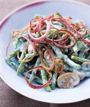 Simmer, stirring, until mixture begins to thicken, 1 to 2 minutes. Add green beans and cook until heated through, 3 to 4 minutes. Top with the onions.